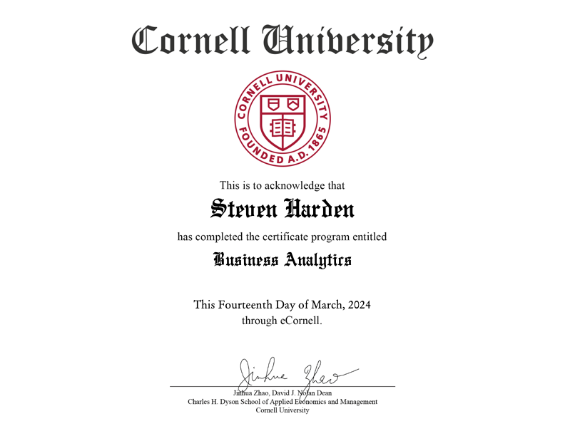 Stanford Product Management Certificate | Business Analytics - Cornell University | Certified Product Owner - Scrum Alliance | Certified Scrum Master - Scrum Alliance | Certified Agility Health Facilitator